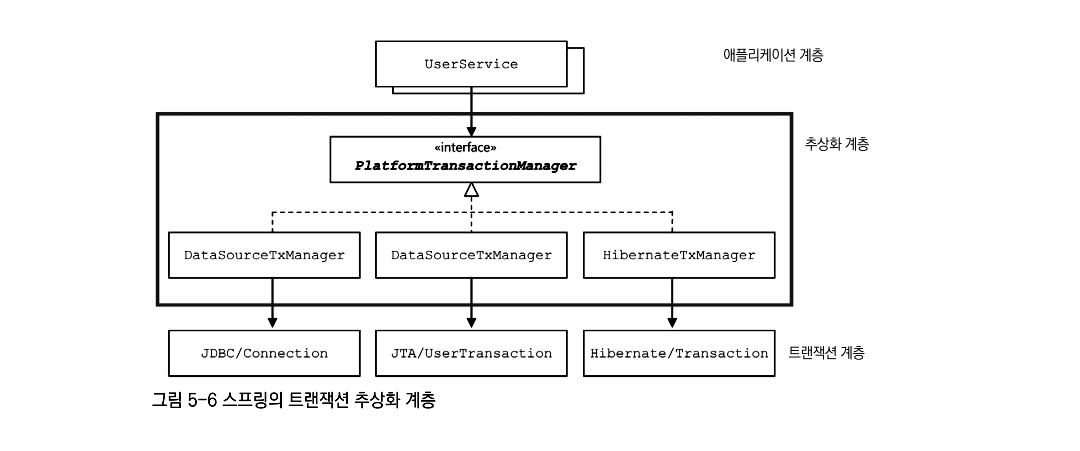 핵심은 추상화 계층의 인터페이스인 FlatformTransactionManager 인터페이스를 두고 이를 구현하는 다양한 서비스의 비즈니스 로직을 추상화 해두었다는 것이다. 개발자는 단순히 FlatformTransactionManager 를 선언해서 이용하면 되고 언제든지 이를 구현하는 또 다른 구현체로 바꿀 수 있다.