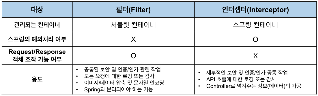 2. 필터의 경우 HttpServlet request / response 객체를 조작할 수 있지만 인터셉터의 경우 불가능하다.