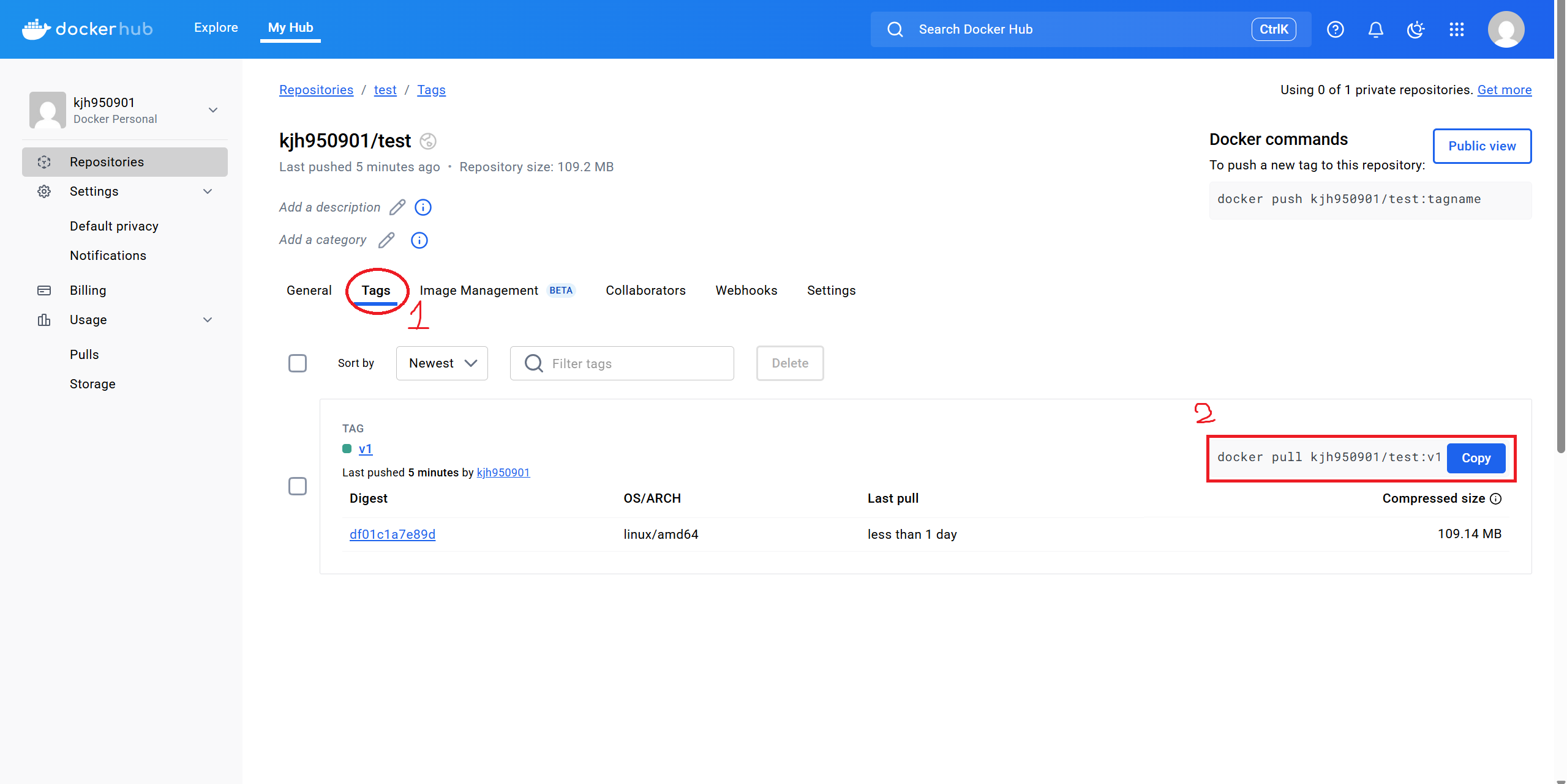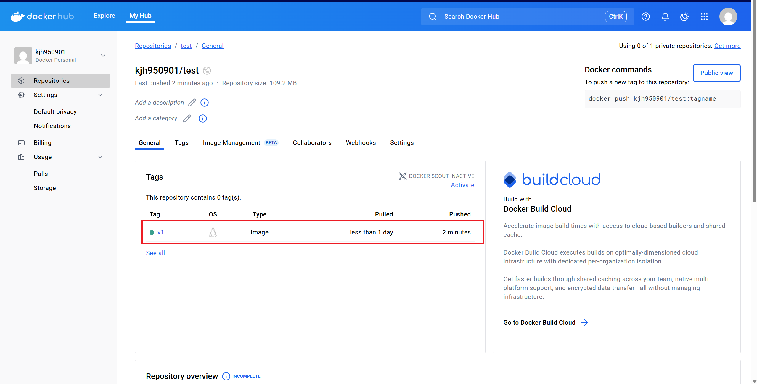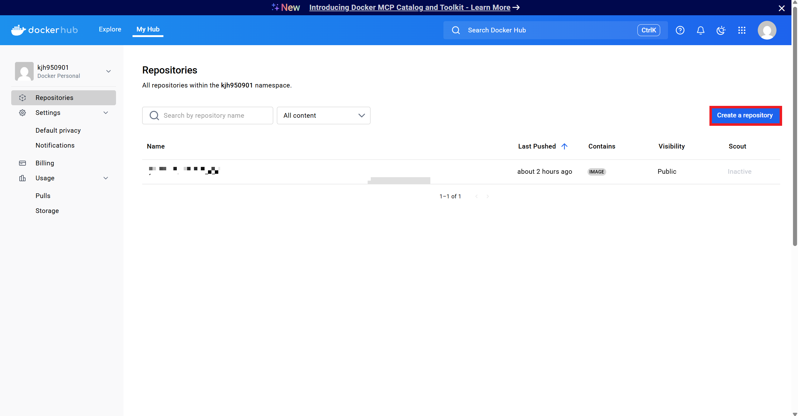 이후, Repository에 들어가면 push된 이미지가 보인다.