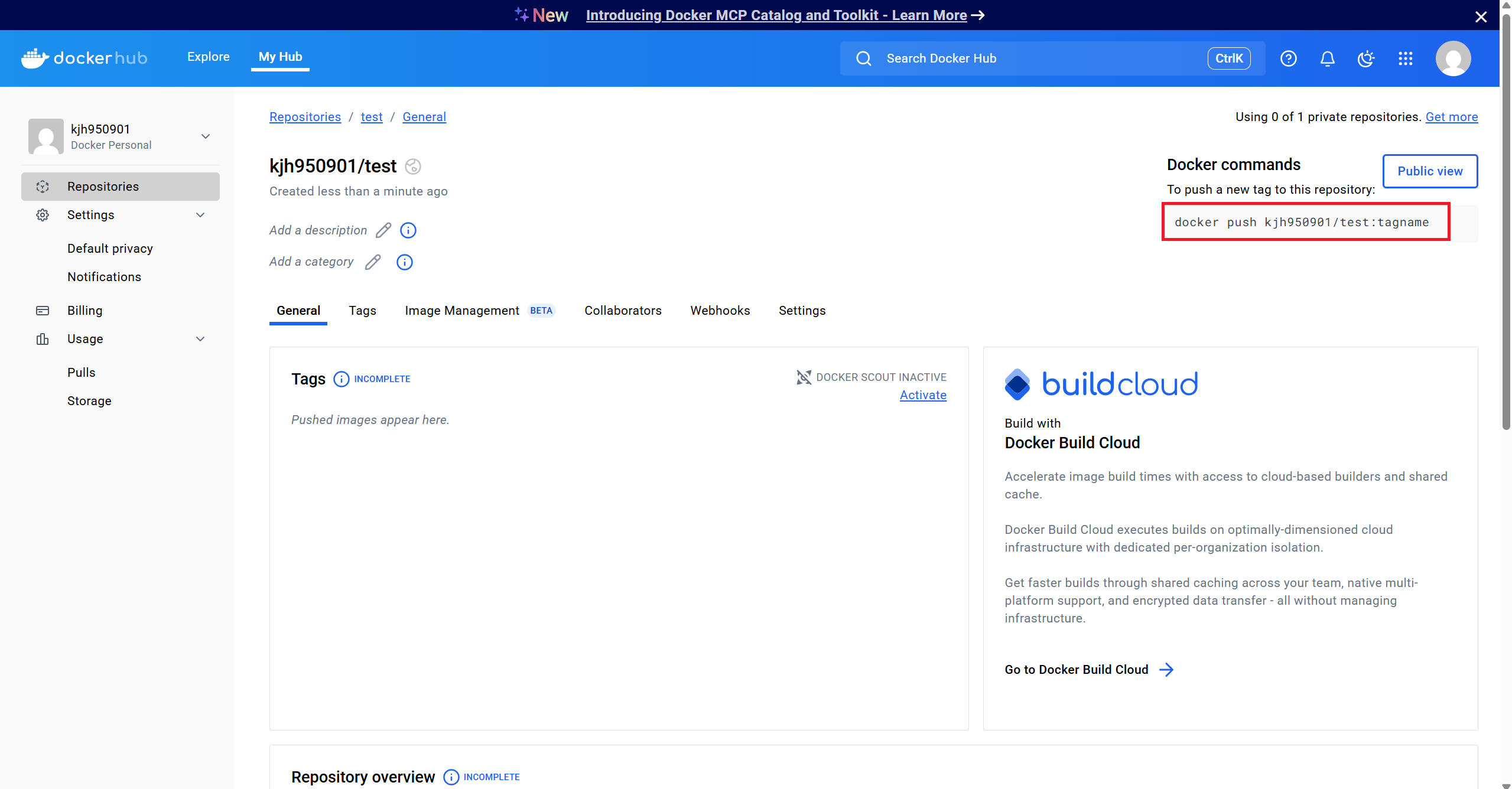 해당 명령어를 입력하여 Repository에 이미지를 Push한다.