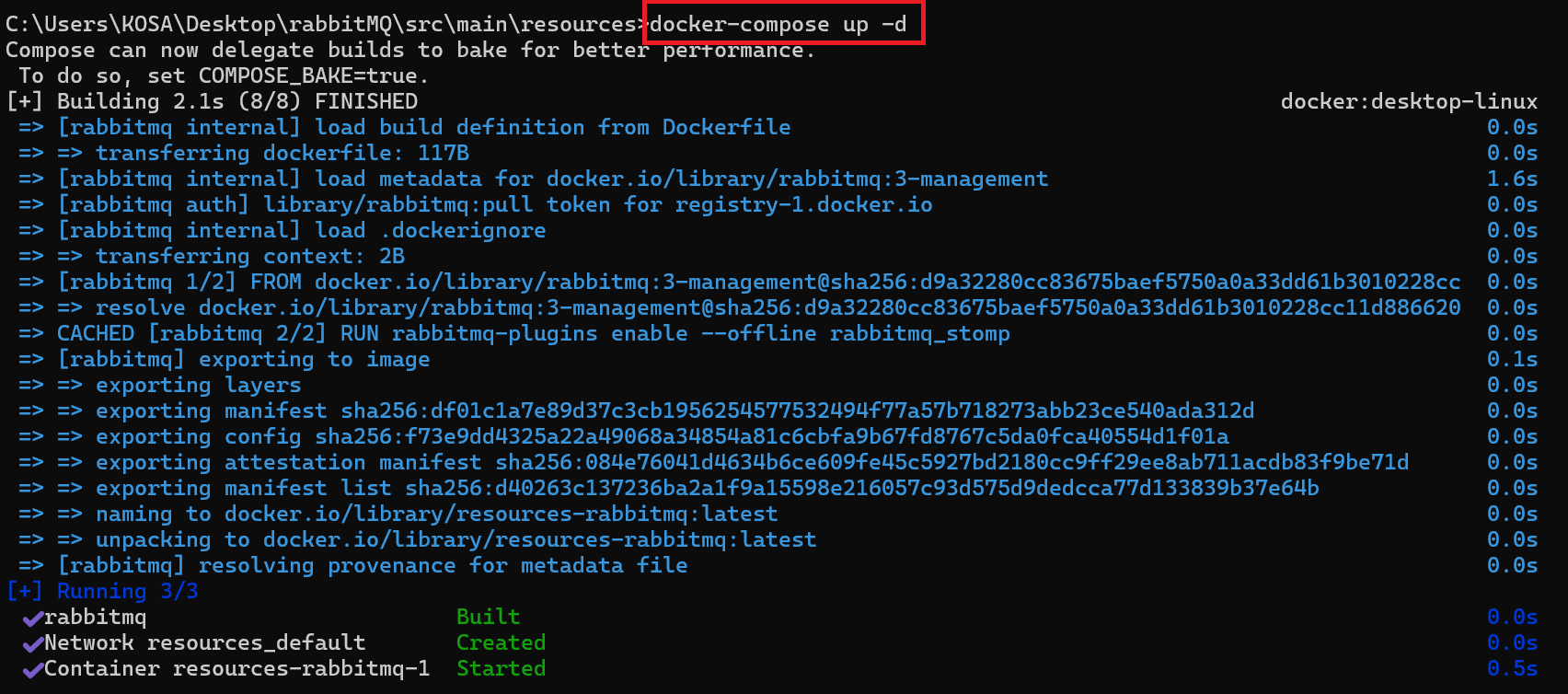 해당 명령어를 실행하면 docker-compose.yml에 정의되어 있는 값들이 백그라운드에서 Docker 이미지를 빌드하고,