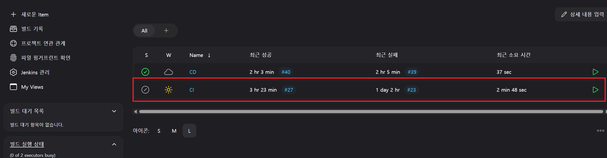 - CI 파이프라인에 변경 사항을 만들기 위해서는 젠킨스에 로그인해 각각의 프리스타일 잡의 설정을 변경해야만 한다.