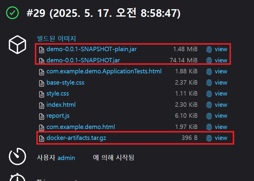 정상적으로 실행되었다면 .jar, docker file 및 기타 파일들이 정상적으로 아카이브에 저장됨을 확인할 수 있다