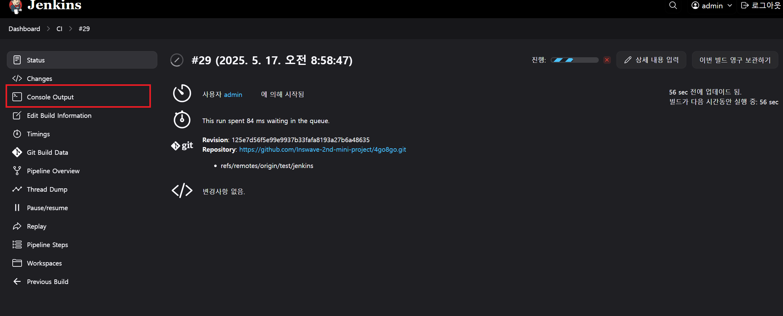 build를 클릭 후, console output을 클릭하면 진행상황 및 예외발생 구간을 알 수 있다.