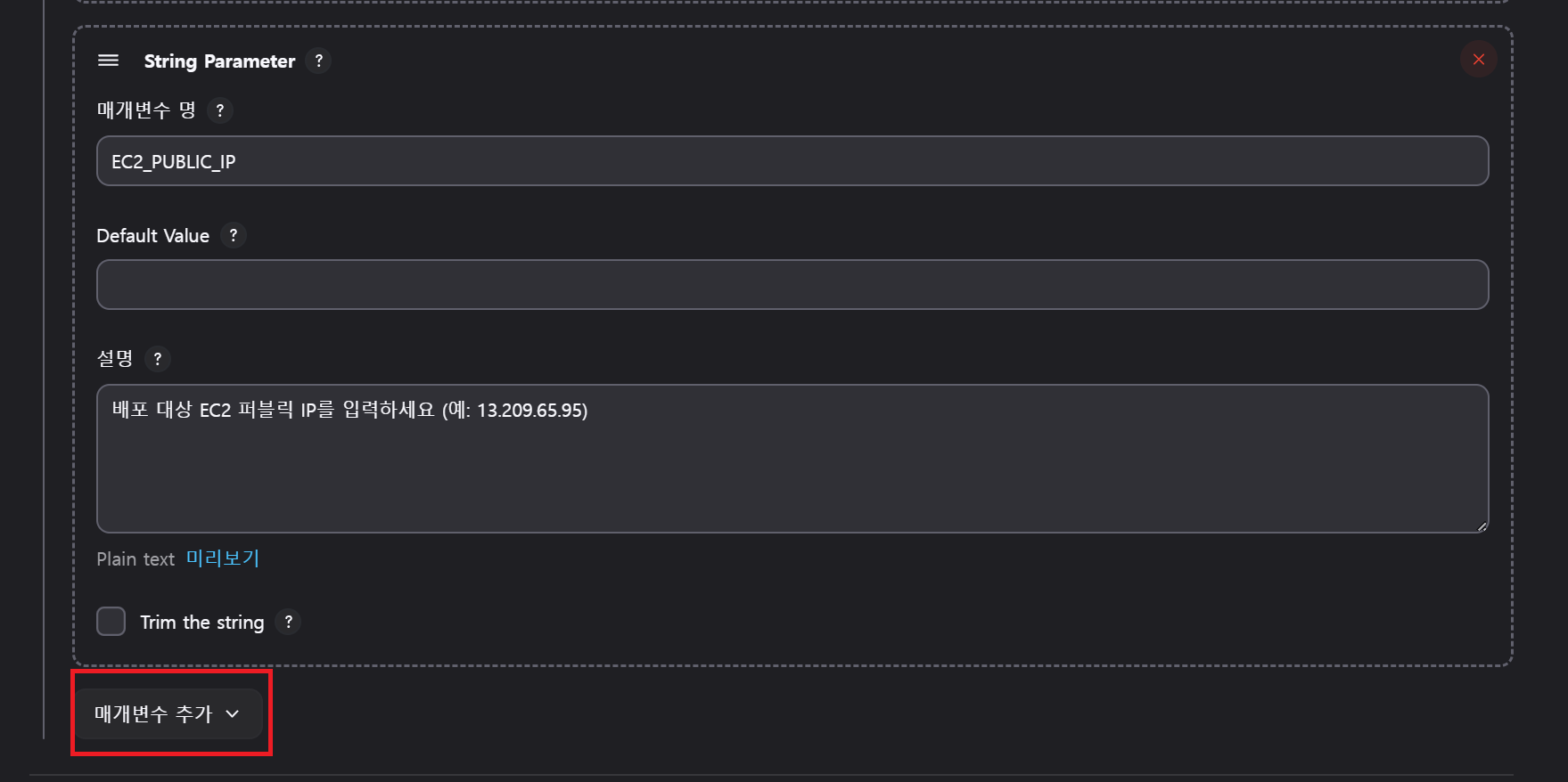 string(name: 'EC2_PUBLIC_IP', defaultValue: '', description: '배포 대상 EC2 퍼블릭 IP를 입력하세요 (예: 13.209.65.95)')