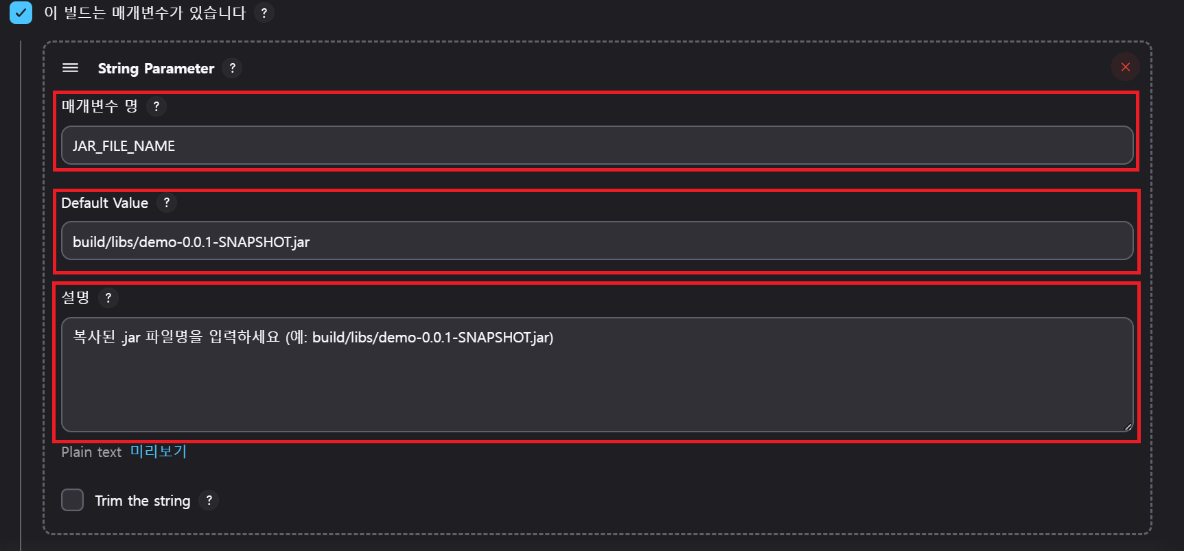 string(name: 'JAR_FILE_NAME', defaultValue: 'build/libs/demo-0.0.1-SNAPSHOT.jar', description: '복사된 .jar 파일명을 입력하세요 (예: build/libs/demo-0.0.1-SNAPSHOT.jar)')