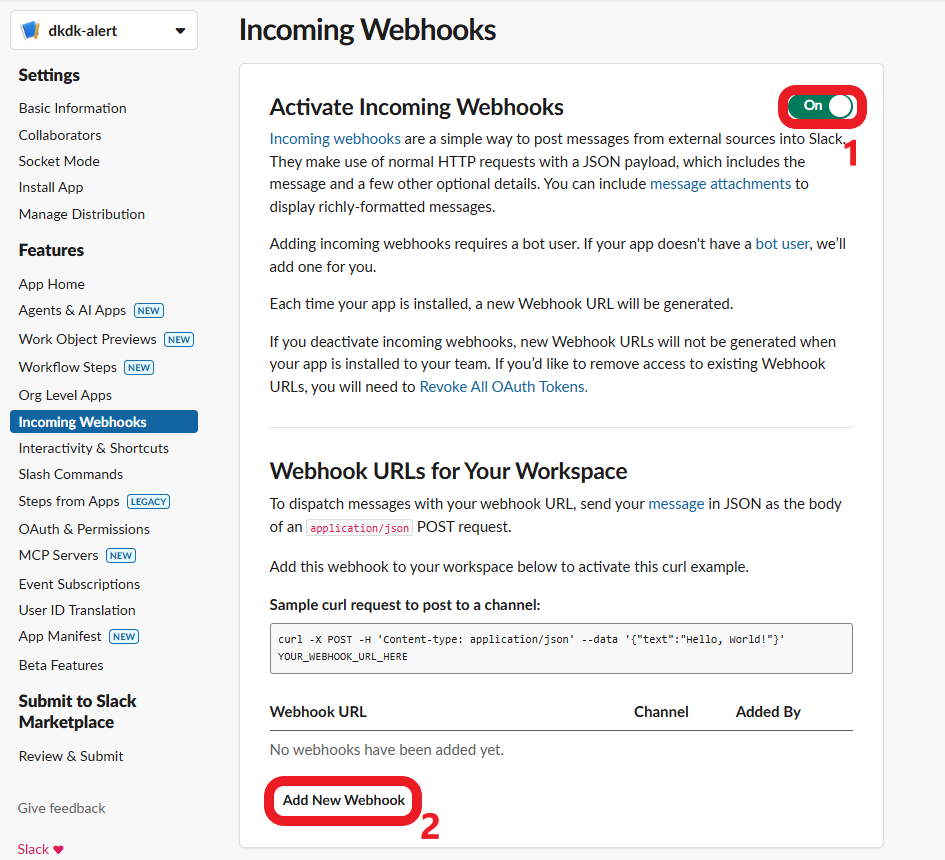 3. Incoming Webhooks → 토글 On → Add New Webhook