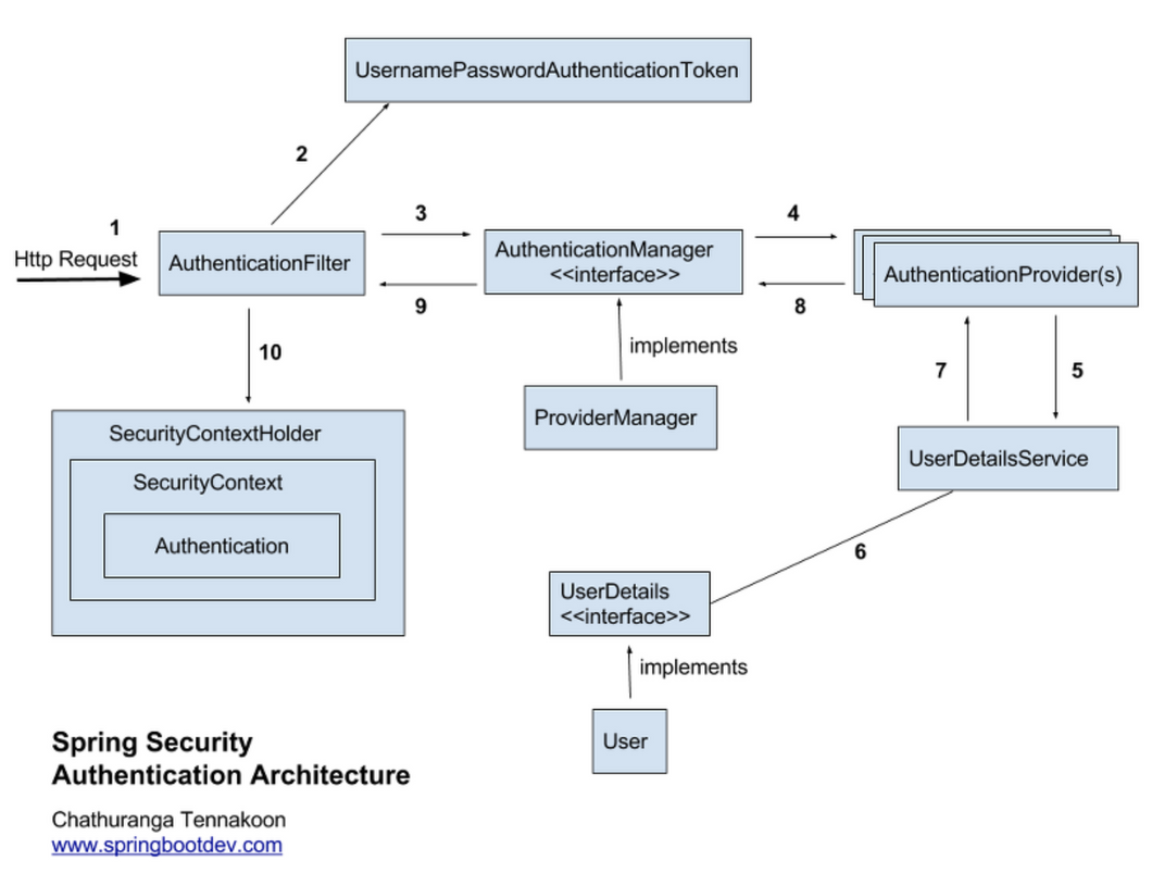 클라이언트가 정보를 요청하면 AuthenticationFilter가 요청을 가로채고, 가로챈 정보를 통해 토큰을 생성한다.
